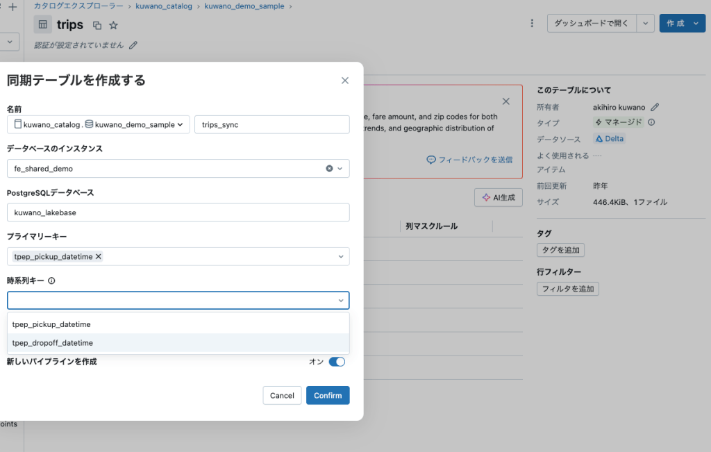 こんな感じで同期テーブルを作成するとDelta Tableの内容をLakebaseへとデータを同期するパイプラインを作成することができます。