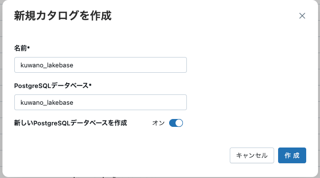 これでUnity Catalog上で”kuwano_lakebase”という形で見れるようになりますね。同時にkuwano_lakebaseという名前でPostgreSQL上にデータベースが作成されます(既存DBを使うこともできます)