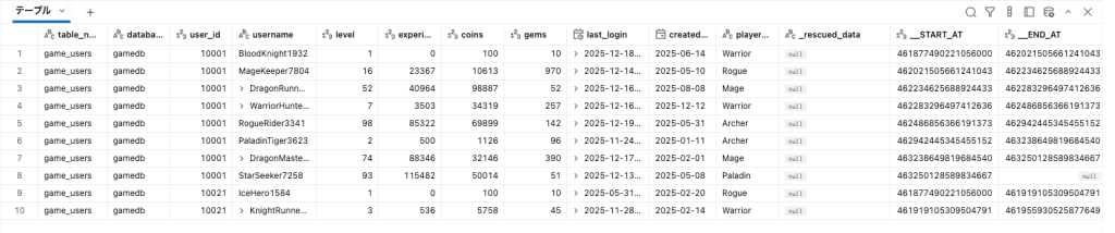 実際にデータが保存されるターゲットのテーブルです。こちらはシンプルにテーブルが作られているだけになります。カラムは自動推論されるので何も指定していません。