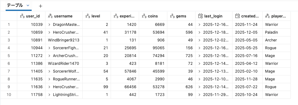 "I","game_users","gamedb","462942445345455152","10001","PaladinTiger3623","2","500","1126","96","2025-11-24 21:54:08","2025-01-11","Archer"