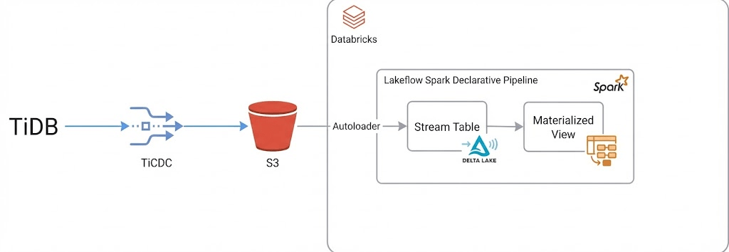 TiDBからのデータを受けるためのTiCDCでデータをS3にリアルタイムに連携し、それをAutoloderで受けてDatabricksへ連携します。